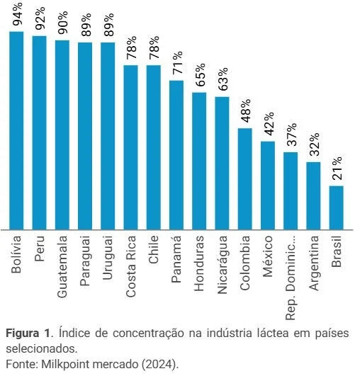 No âmbito da estrutura produtiva, a concentração da produção aumentou em 2024, e deve continuar nos próximos anos, tanto quanto ao número de produtores quanto às regiões produtoras. Os pagamentos da indústria por volume e qualidade tende a acelerar esse processo. Concentração também tem acontecido na indústria láctea. Todavia, comparativamente aos países vizinhos e fornecedores Argentinos e Uruguaios, a concentração industrial brasileira ainda é baixa. As quatros maiores empresas de lácteos brasileiras detêm 21,0% do mercado, enquanto na Argentina 32,0% e no Uruguai 89,0%, figura 1.