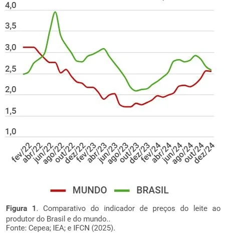 Os preços ao produtor geraram um cenário positivo em 2024, permanecendo boa a rentabilidade no início de 2025. Mas, numa comparação de preços do Brasil com o mundo (estes, em valores convertidos de kg para litro e do Dólar para o Real): os preços mundiais se apresentaram menores nos últimos 30 meses (Figura 1).