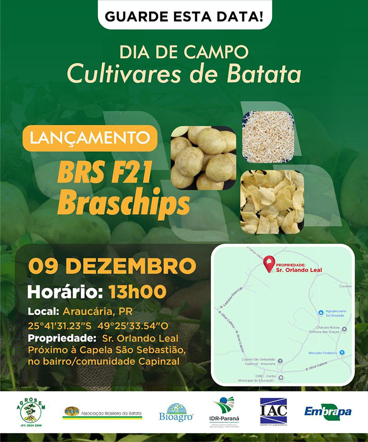 A Embrapa e parceiros realizam, no dia 9 de dezembro, um Dia de Campo para apresentação de cultivares de batata desenvolvidas pela pesquisa, com destaque para o lançamento da BRS F21 Braschips, nova cultivar desenvolvida especialmente para a indústria. O evento terá início às 13h30min, na propriedade do produtor Orlando Leal, na comunidade Capinzal, em Araucária (PR). A programação inclui apresentação de clones e cultivares e de seus desempenhos em condições de campo, além de orientações técnicas para produtores e representantes do setor.