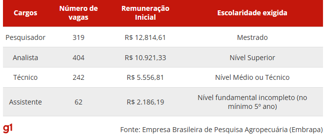 A Empresa Brasileira de Pesquisa Agropecuária (Embrapa) publicou, nesta sexta-feira (06), o edital com as regras para o novo concurso público. Estão sendo ofertadas 1.027 vagas em todos os níveis de escolaridade, com remuneração inicial de até R$12,8 mil.