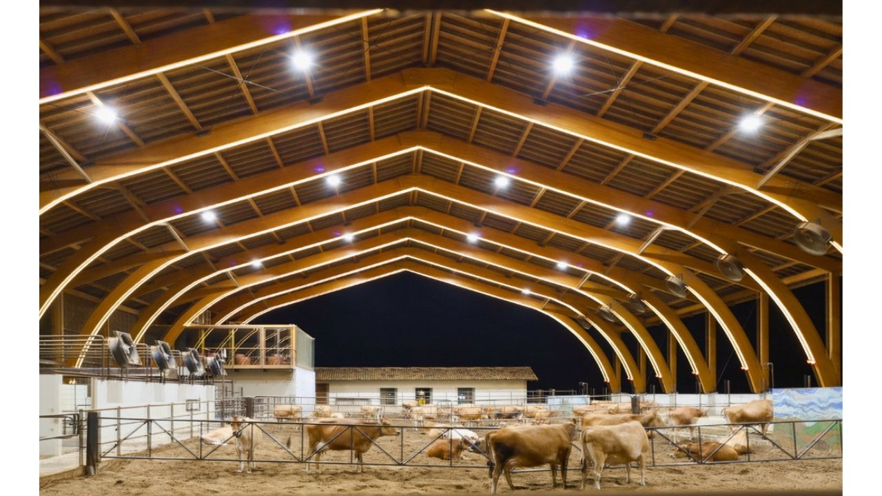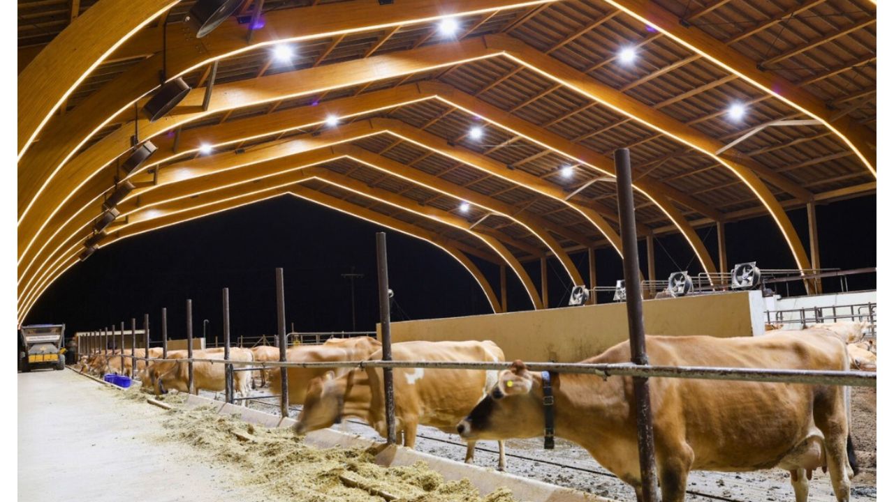 Empresa especializada em mega construções de madeira divulga fotos de um galpão para vacas leiteiras; veja onde fica a fazenda e os detalhes da construção