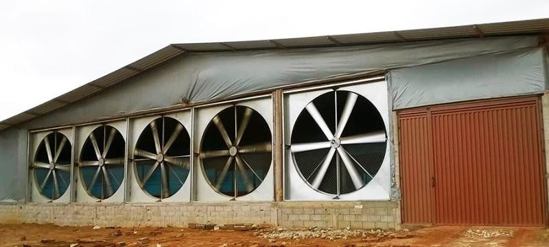 - Exaustores de alta potência na parede oposta, que puxam o ar externo para dentro do galpão, forçando sua passagem pelas placas úmidas.