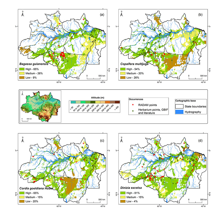 Entre os resultados, o estudo demonstra que espécies como o angelim-vermelho (Dinizia excelsa) apresentaram até 81% de alta aptidão topoclimática em áreas antropizadas (degradadas ou alteradas pelo homem), revelando um vasto potencial para restauração produtiva. Além disso, espécies com maior plasticidade ambiental, como o marupá (Simarouba amara), podem atuar como “coringas” em locais de menor adequação climática, desde que acompanhadas de manejo adaptativo.