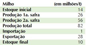 Tabela 1. Informações sobre o milho, em milhões de toneladas.