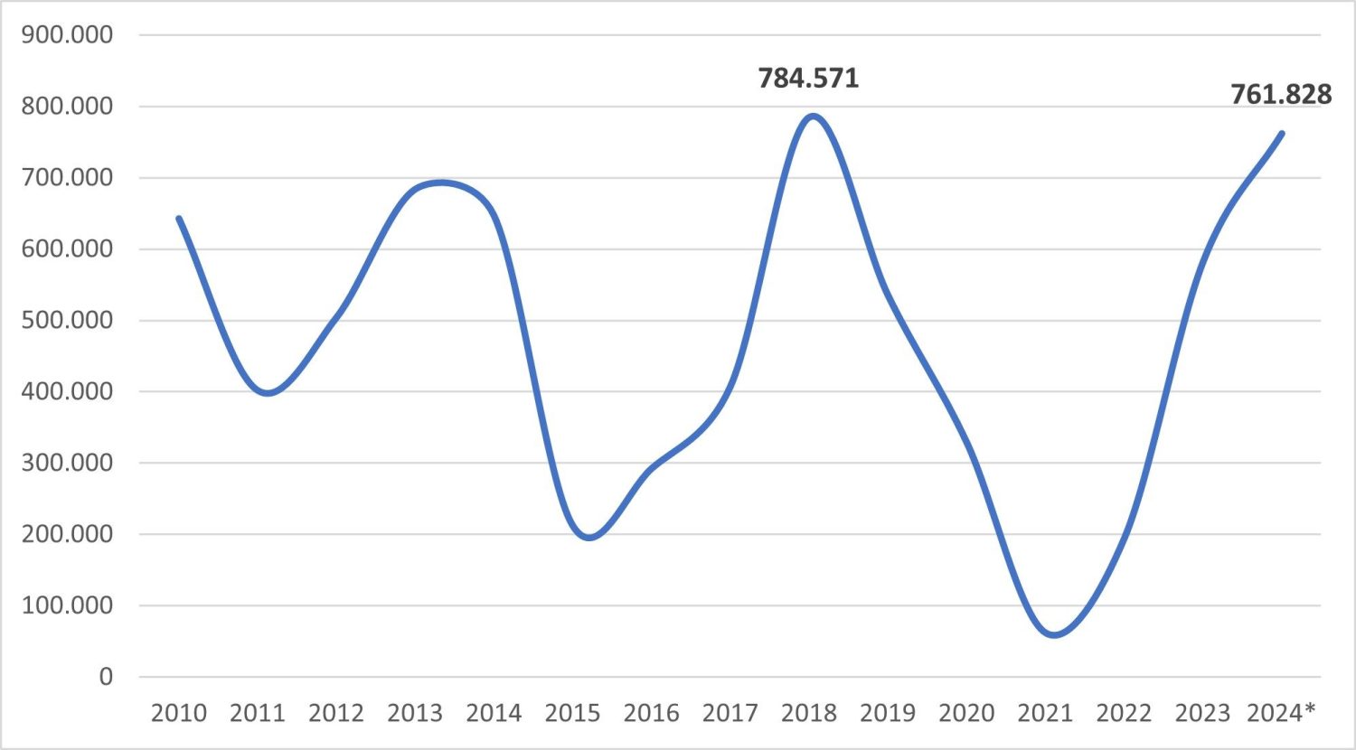 Em 2024, a quantidade atingida na exportação de bovinos vivos até setembro, acompanhou o ritmo, dos outros meses, com 761,8 mil cabeças embarcadas, superando todos os anos, com exceção de 2018, a expectativa é que a quantidade aumente e seja recorde nesse ano.