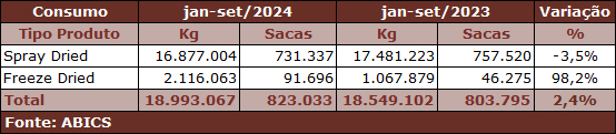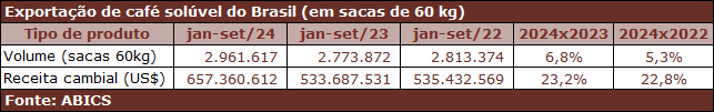O relatório da Abics mostra que o Brasil consumiu o equivalente a 823.033 sacas de café solúvel de janeiro ao fim de setembro deste ano, o que representa uma alta de 2,4% em relação às 803.795 sacas absorvidas pelo mercado nacional nos mesmos nove meses de 2023.