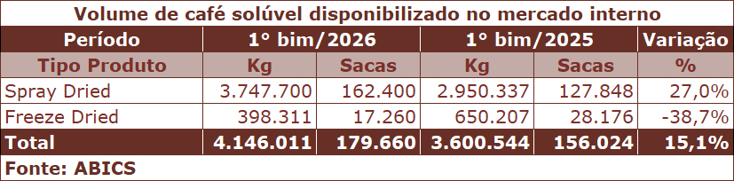 Dando sequência a uma evolução iniciada há uma década, o consumo interno de café solúvel no Brasil subiu 15,1% no primeiro bimestre de 2026. O mercado nacional absorveu 4,146 mil toneladas (179.660 sacas), acima das 3,601 mil toneladas (156.024 sacas) do ano passado.