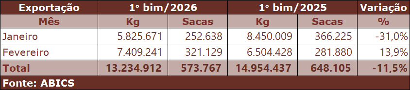 Por outro lado, o peso das tarifas ainda é sentido na análise do primeiro bimestre de 2026, quando o Brasil embarcou 13,235 mil toneladas (573.767 sacas), volume 11,5% inferior ao aferido nos dois primeiros meses de 2025. A receita também cai nesse mesmo comparativo, para US$ 161,059 milhões.