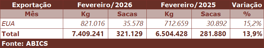 No primeiro bimestre de 2026, os EUA, reforçando a importância do café solúvel brasileiro a esse mercado, foram os principais compradores do produto, com a importação de 1,769 mil toneladas (76.766 sacas), montante 2,5% menor do que o apurado nos mesmos dois meses em 2025.