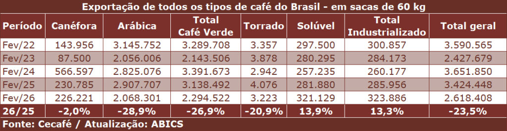 Diferente do desempenho negativo registrado nos embarques dos cafés verde, torrado e torrado e moído em fevereiro, as exportações brasileiras de café solúvel somaram 7,409 mil toneladas – equivalentes a 321.129 sacas de 60 kg – e cresceram 13,9% na comparação com as 6,504 mil toneladas (281.880 sacas) registradas no mesmo mês de 2025. Em receita cambial, o incremento foi de 10,8%, com os ingressos chegando a US$ 90,289 milhões no mês passado. Os dados são da Associação Brasileira da Indústria de Café Solúvel (Abics).
