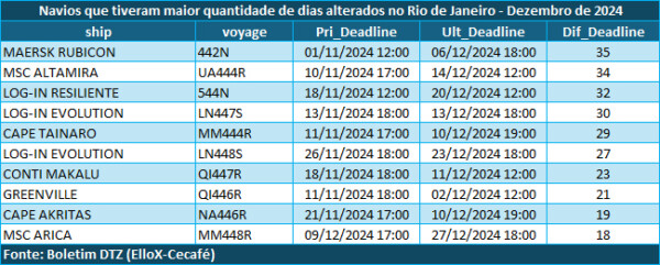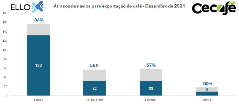 O complexo portuário do Rio de Janeiro (RJ), o segundo maior exportador dos cafés do Brasil, com 27,9% de participação nos embarques em 2024, teve índice de atrasos de 56% em dezembro, com o maior intervalo sendo de 35 dias entre o primeiro e o último deadline. Esse percentual implica que 32 dos 57 navios destinados às remessas do produto sofreram alteração de escalas.