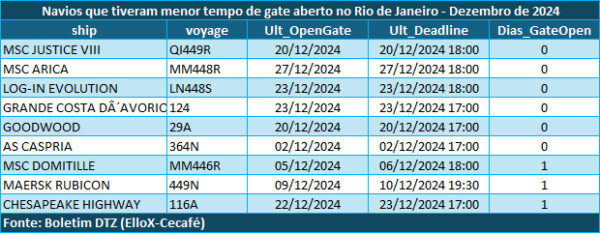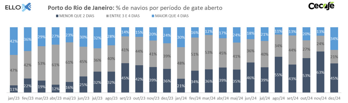 Também no último mês do ano passado, 34% dos procedimentos de exportação tiveram prazo superior a quatro dias de gate aberto por porta-contêineres nos portos fluminenses; 21% registraram entre três e quatro dias; e 45% possuíram menos de dois dias.
