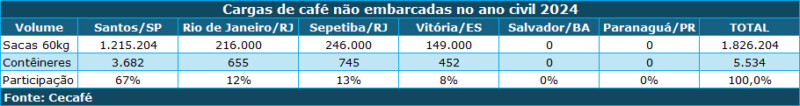 Um volume de 1,826 milhão de sacas de café – 5.534 contêineres – ficaram armazenadas nos principais portos brasileiros sem conseguir embarque em 2024, conforme levantamento realizado pelo Conselho dos Exportadores de Café do Brasil (Cecafé) junto a empresas associadas. “O motivo desses não embarques foram os elevados e constantes atrasos e alterações de escala de navios para exportação, além de frequentes rolagens de cargas”, explica o diretor técnico da entidade, Eduardo Heron.