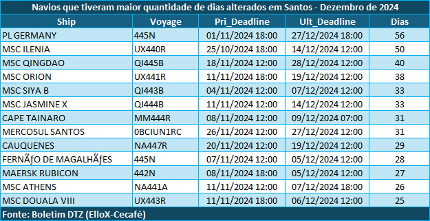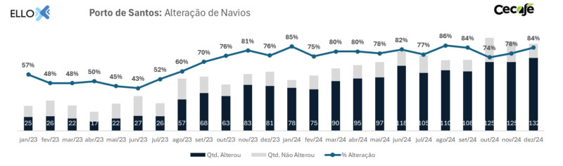 De acordo com os dados do Boletim DTZ, o Porto de Santos, que respondeu por 68% dos embarques de café no acumulado de 2024, registrou um índice de 84% de atraso ou alteração de escalas de navios em dezembro, o que envolveu 132 do total de 157 embarcações.