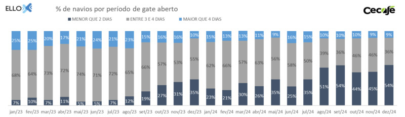 Ainda no mês retrasado, apenas 9% dos procedimentos de embarque tiveram prazo maior do que quatro dias de gate aberto por navios no embarcadouro santista. Outros 36% possuíram entre três e quatro dias e 54% tiveram menos de dois dias.