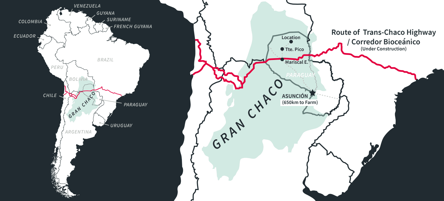 A propriedade está situada na região do Gran Chaco, área que vem se consolidando como uma nova fronteira produtiva da América do Sul. O Paraguai vive um ciclo de expansão do agronegócio, impulsionado por: