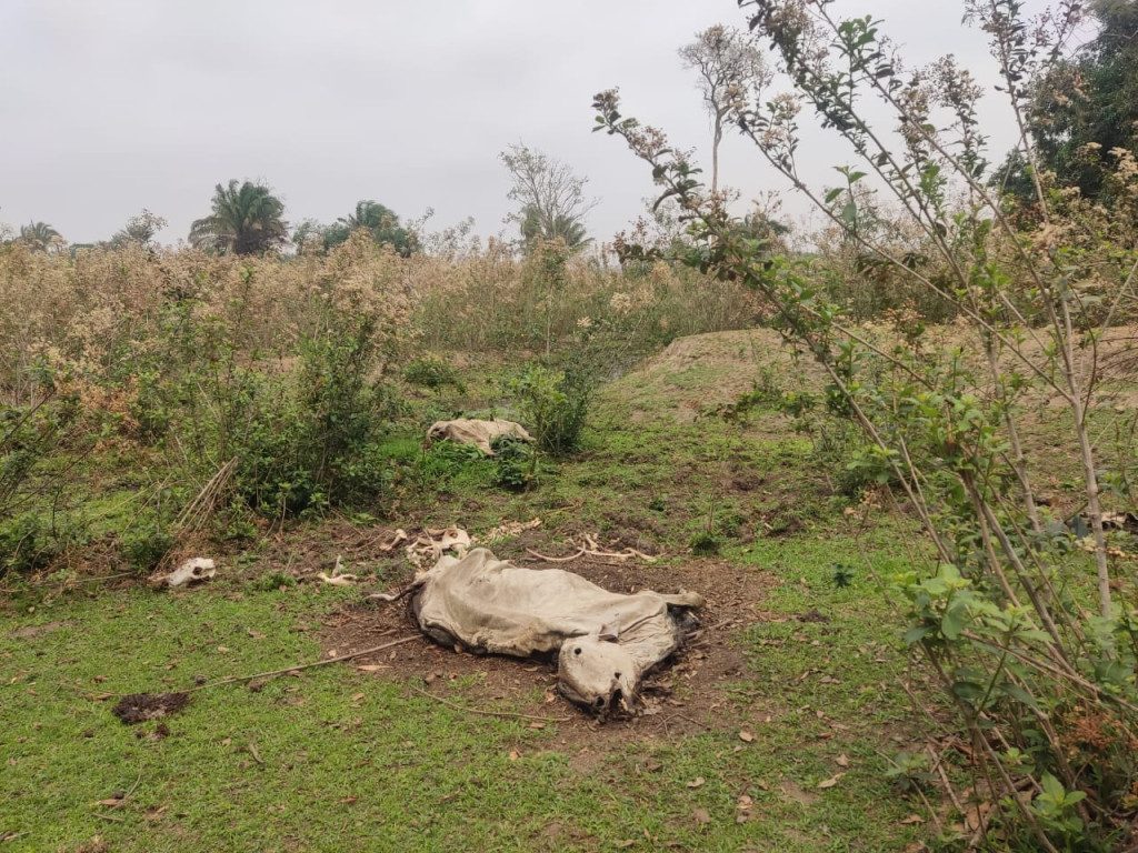 Nas propriedades, os policiais constataram a veracidade das denúncias. Diversos animais mortos foram encontrados espalhados pelas áreas, além de várias ossadas e carcaças depositadas em um córrego, sem qualquer preocupação com o descarte sanitário, o que gerou risco de contaminação das águas.