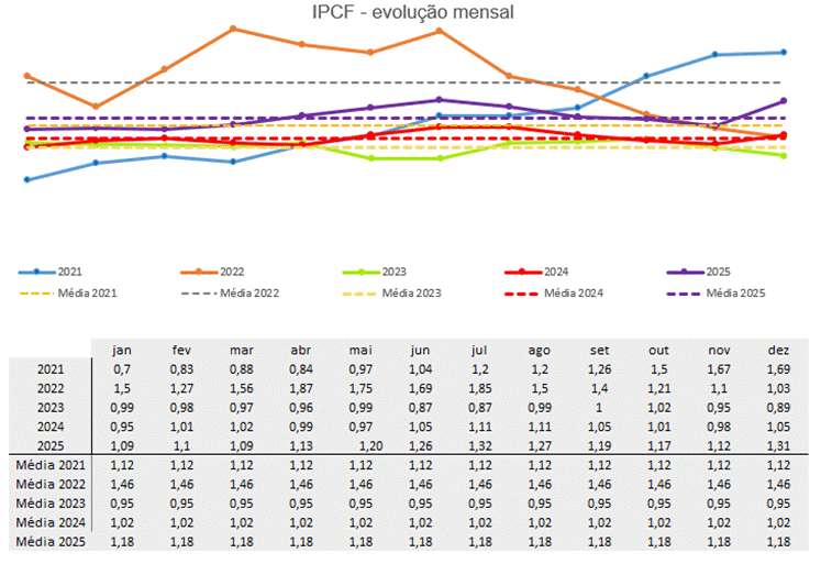 Em 2025, o IPCF registrou uma média anual de 1,18, refletindo um ano marcado por volatilidade nos mercados agrícolas e de insumos. Apesar desse cenário, o IPCF demonstrou resiliência ao longo de 2025, refletindo a capacidade de adaptação do setor às condições internacionais e mantendo um ambiente saudável de competitividade para o produtor brasileiro.