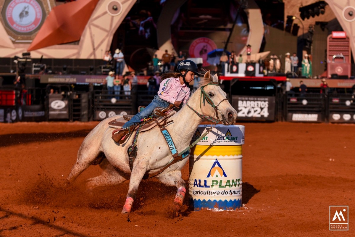A pequena barretense Helena Junqueira Franco, 8 anos, montando o animal Briscate Zorrero, é a campeã da categoria Mirim dos Três Tambores. A jovem competidora fez a passada com o tempo de 18.489, e conquistou o bicampeonato de Barretos. “Eu gostaria de agradecer muito os meus treinadores e toda a minha família. É muito legal ser campeã de Barretos”, afirmou Helena.