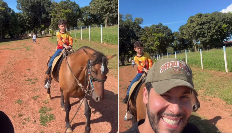 No registro mais recente, além do passeio a cavalo, pai e filho também aparecem aproveitando momentos de lazer, como um banho de mangueira após a atividade — uma cena que reforça o clima leve, familiar e afetivo da ocasião. A influenciadora Gabriela Versiani também compartilhou imagens do dia e resumiu o sentimento em uma frase simples: “A vida é boa demais”.