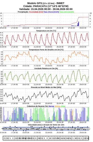 Figura 2: Meteograma do Modelo GFS (13 X 13 km), para o município de Paracatu (MG) no período entre 14 e 30 de abril de 2026. Fonte: INMET.