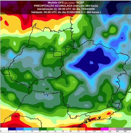 No estado de Goiás, os maiores acumulados previstos concentram-se nas regiões leste e norte, com valores entre 30 e 70 mm. Já no sul goiano, as chuvas devem ocorrer de forma isolada e com baixos volumes, variando entre 7 e 20 mm. Nessa região, os acumulados tendem a permanecer abaixo da climatologia de abril, quando normalmente são registrados totais entre 80 e 100 mm.