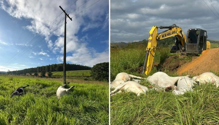 Onze vacas prenhes de sete meses e quatro bezerros morreram após serem atingidos por um fio de alta tensão que se rompeu na tarde de sábado (31), na Fazenda Tupã, na zona rural do bairro Bebedouro, em Linhares, no Norte do Espírito Santo. O dono da propriedade, Adão Cellia, de 67 anos, estima um prejuízo superior a R$ 80 mil e responsabiliza a concessionária de energia que atende a região, citando constantes “remendos” na rede elétrica e frequentes quedas de energia que, segundo ele, colocam à prova a paciência dos moradores.