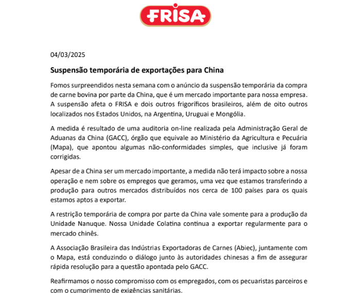 Fomos surpreendidos nesta semana com o anúncio da suspensão temporária da compra de carne bovina por parte da China, que é um mercado importante para nossa empresa. A suspensão afeta o FRISA e dois outros frigoríficos brasileiros, além de oito outros localizados nos Estados Unidos, na Argentina, Uruguai e Mongólia.