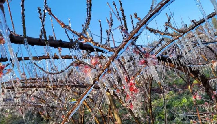 A geada é uma das maiores ameaças à fruticultura brasileira. Esse fenômeno ocorre quando a temperatura do ar, próxima à superfície, cai a ponto de formar cristais de gelo sobre plantas e solos. Para espécies sensíveis, como o pêssego, a florada exposta ao frio intenso pode comprometer completamente a produção. Culturas como uva, maçã e café também figuram entre as mais vulneráveis.