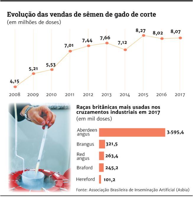 Grande parte das doses de sêmen inseminadas em vacas zebu é de touros criados no Rio Grande do Sul – que concentra o maior rebanho de raças britânicas e sintéticas do país. E a melhor forma de levar essa genética para o centro e norte do país é “dentro do botijão”, explica Fábio Barreto, diretor da Progen, central de inseminação com sede em Dom Pedrito, na Campanha: