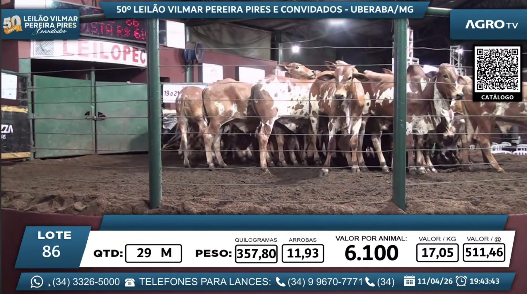Já o Lote 86, composto por 29 machos/garrotes de genética V3, classificados como “cara limpa”, manteve o padrão de liquidez e consistência, sendo vendido por R$ 6.100, novamente para o Espólio de Márcio Ferreira de Souza.