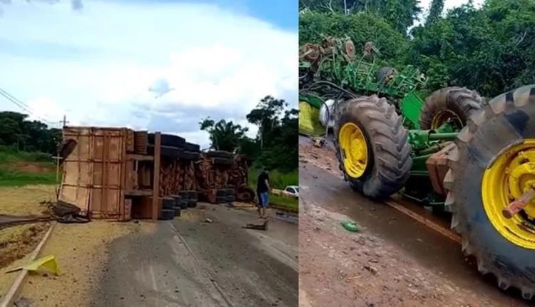 Com o impacto, tanto o trator quanto a carreta tombaram sobre a pista.
