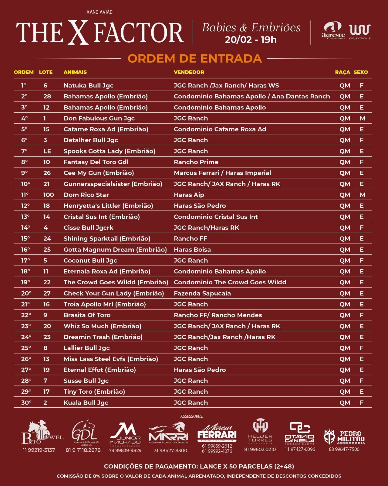 No dia 20 de fevereiro, durante o Leilão The X Factor, serão ofertados embriões, com garantias de coberturas dos garanhões Don Toro HJG, Gunner e Maverick. Além disso, Quentão Zorrero estará presente em algumas das éguas mais valiosas do Brasil, como Cafame Roxa, Bahamas Apollo, Eternala Roxa, Cristal Sus, Miss Lass Steel e Tiny Toro, elevando ainda mais a qualidade e o prestígio do evento.