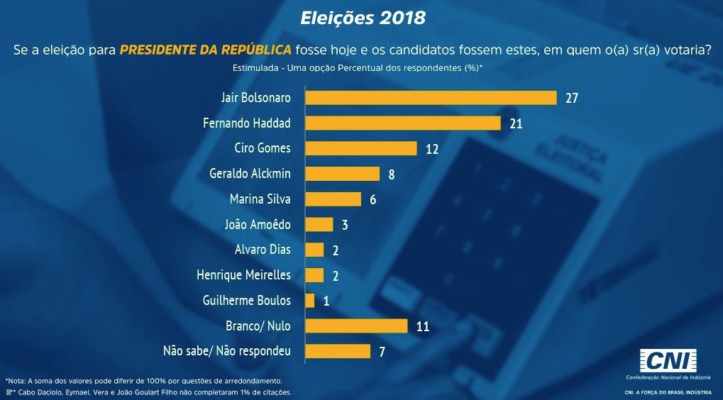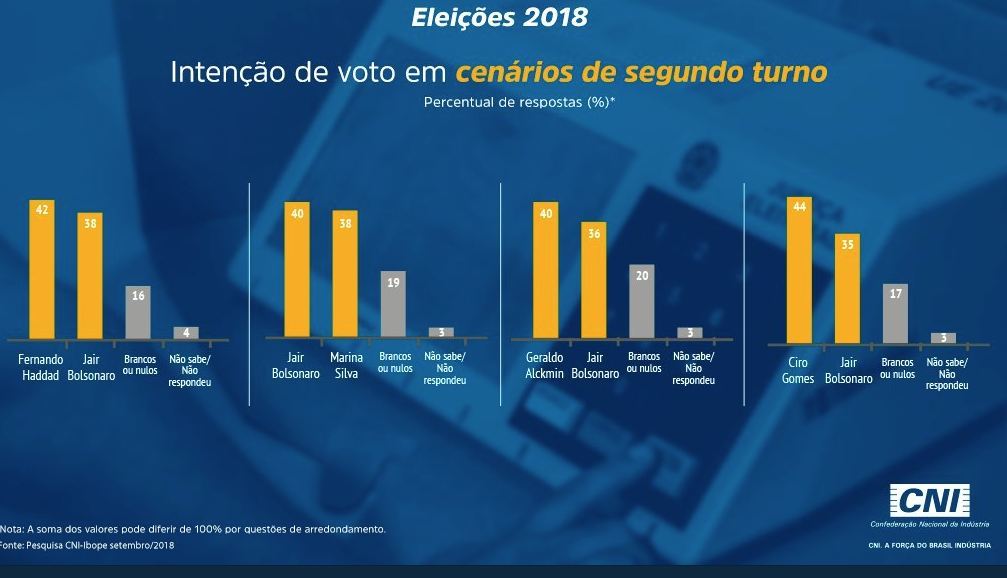 Cabo Daciolo (Patriota), Vera Lúcia (PSTU), João Goulart Filho (PPL) e Eymael (DC) não pontuaram neste levantamento do Ibope. Onze por cento dos entrevistados declararam voto em branco ou nulo; e 7% não responderam ou não sabem em quem vão votar.