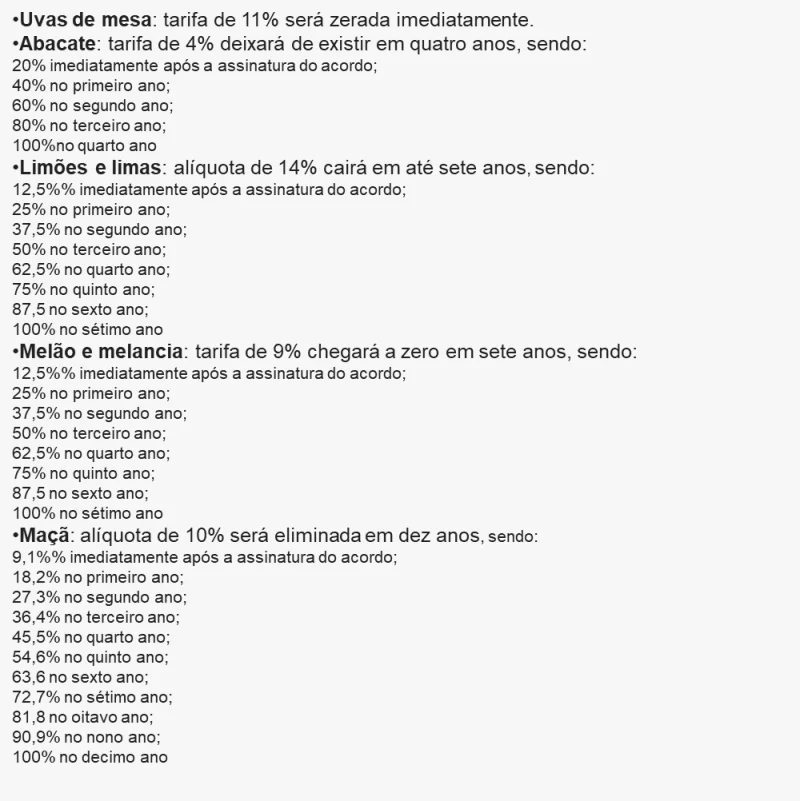 A avaliação do setor de fruticultura sobre o acordo entre Mercosul e União Europeia é positiva, especialmente pelo cronograma de redução gradual das tarifas de importação aplicadas às frutas brasileiras. Segundo Luiz Roberto Barcelos, conselheiro da IFPA e diretor da Abrafrutas, o processo de desgravação será escalonado conforme o produto: a uva terá isenção imediata, enquanto melão terá prazo de até sete anos; limão e abacate terão redução ao longo de quatro anos, com queda de 25% ao ano; e a maçã, por ser uma fruta produzida no hemisfério norte, terá o maior prazo, de até dez anos, mantendo um caráter de proteção aos produtores europeus.