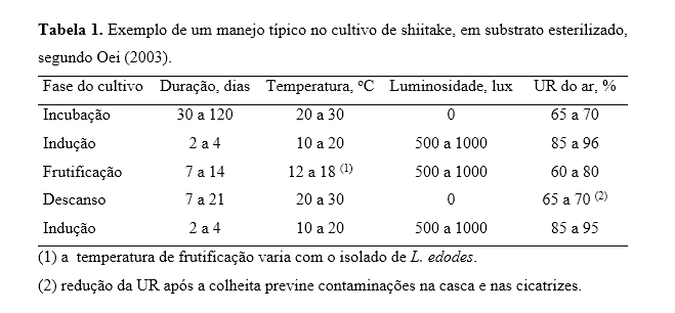 Portanto é fundamental ter uma infraestrutura adaptada para evitar variações bruscas de temperatura durante a maturação do micélio e utilizar ambientes distintos para o crescimento vegetativo e crescimento reprodutivo, respeitando os parametros elucidados na Tabela 1.
