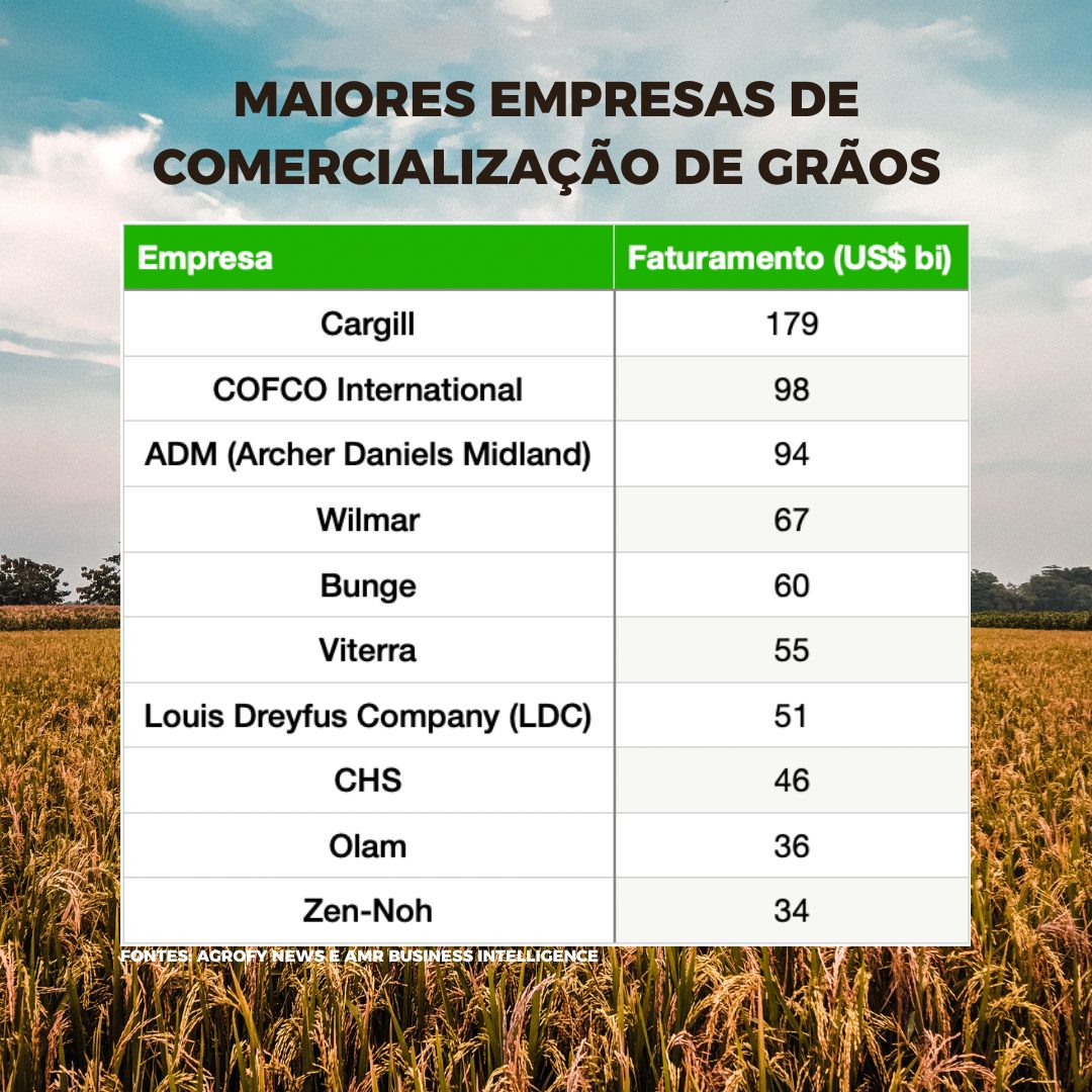 Com forte atuação no Brasil, a Bunge teve um faturamento de US$ 60 bilhões. Recentemente, a empresa anunciou uma fusão com a Viterra, o que pode ampliar sua presença no mercado global e impactar diretamente o ranking.