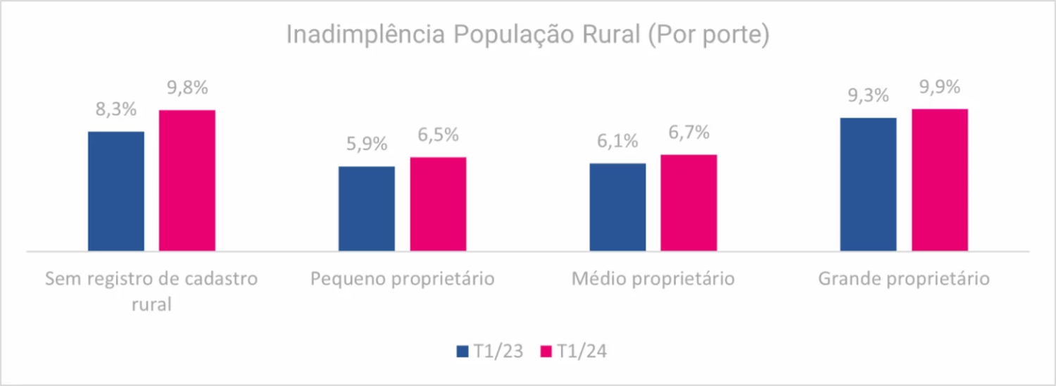 Na análise por porte, considerando todos os setores avaliados, os pequenos proprietários rurais registraram o menor percentual de inadimplência (6,5%) no primeiro trimestre deste ano. Em comparação com o mesmo período de 2023, houve um acréscimo de 0,6 pontos percentuais, quadro de relativa estabilidade.