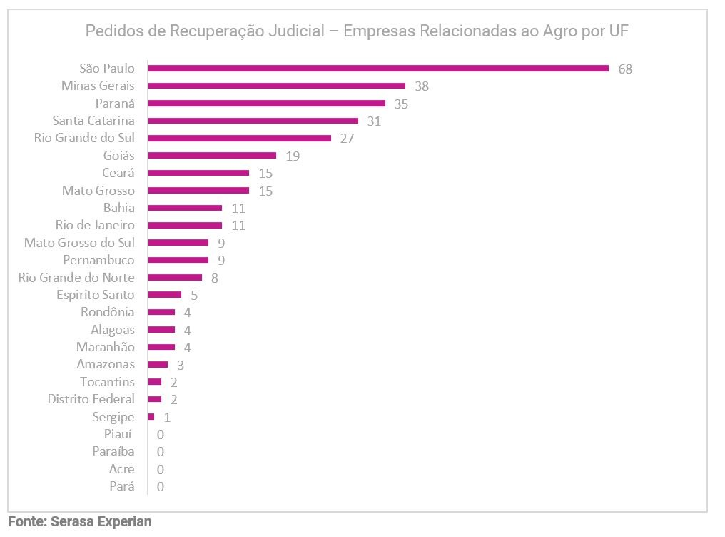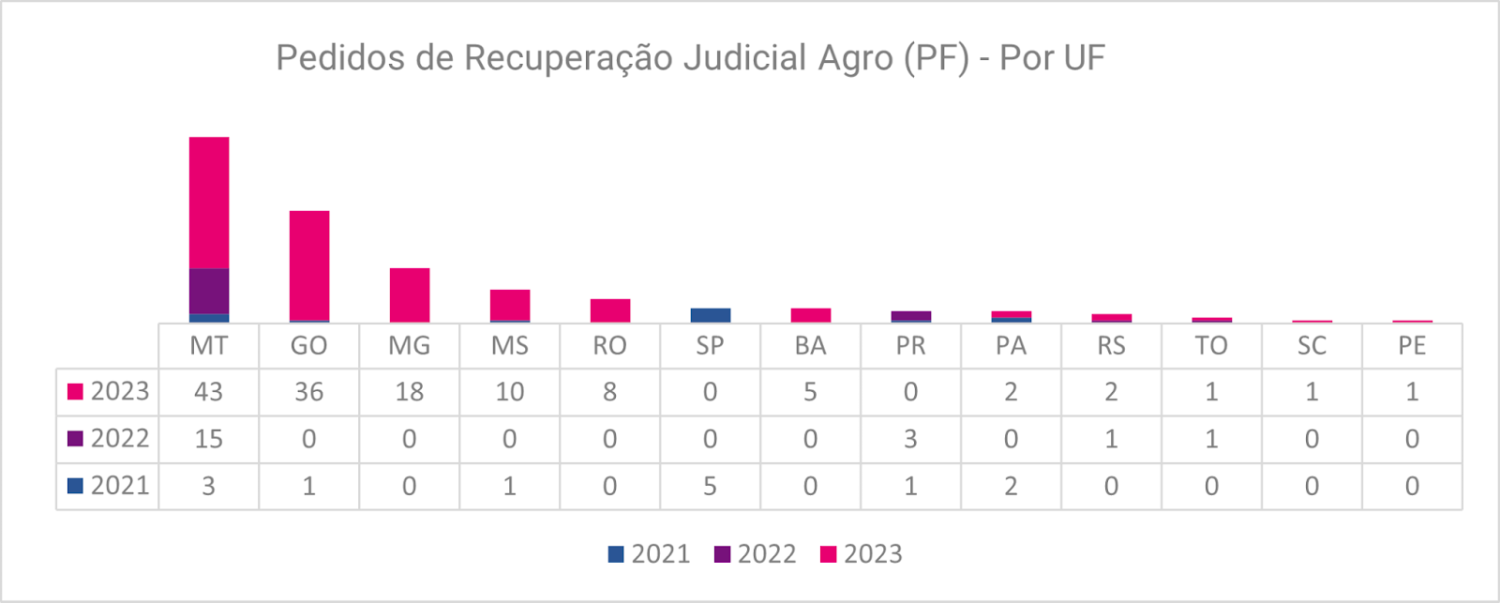 Os estados que lideraram as solicitações (por empresas agro) de recuperação judicial em 2023 foram: São Paulo, Minas Gerais e Paraná [veja gráfico abaixo].