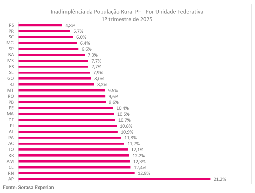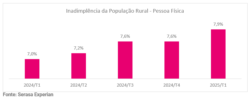 Informações inéditas da Serasa Experian, primeira e maior datatech do Brasil, mostram o cenário de inadimplência da população rural que atua como pessoa física no primeiro trimestre de 2025. Segundo a datatech, o índice nacional chegou a 7,9%, com aumento de 0,3 ponto percentual frente ao último trimestre de 2024. Ainda assim, mesmo que na prática a variação possa ser vista como uma estabilidade existe um viés de alta que precisa ser considerado. Além disso, frente ao primeiro trimestre de 2024, feita a comparação ano a ano, é possível identificar um aumento um pouco mais expressivo, de 0,9 ponto percentual.