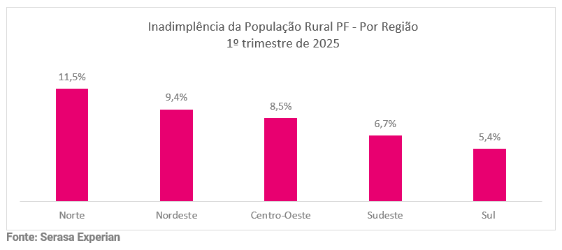 A análise por regiões mostrou como o Norte do país possui o maior percentual de pessoas físicas que atuam no agronegócio com o nome no vermelho. Em sequência estavam o Nordeste, o Centro-Oeste, o Sudeste e o Sul – que continua com os menores percentuais. Confira no gráfico a seguir os dados na íntegra: