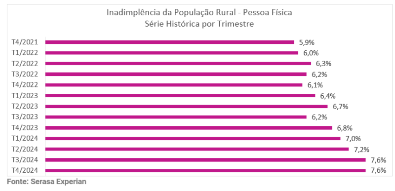Dados desenvolvidos pela Serasa Experian, mostraram que a inadimplência da população rural, considerando dívidas vencidas há mais de 180 dias e que foram contraídas junto a empresas de setores que se relacionam às principais atividades do agronegócio, se mantiveram estáveis (7,6%) nos últimos três meses de 2024 em relação ao trimestre anterior. Mesmo na comparação anual, feita antes do quarto trimestre de 2023, a alta registrada foi sutil, de 0,8 ponto percentual. Veja no gráfico a seguir a série histórica do índice: