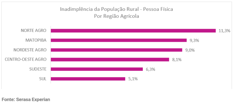 O recorte por regiões agrícolas mostrou que, no último trimestre de 2024, a população rural no Sul registrou o menor índice de inadimplência, esse de 5,1%. Por outro lado, o “Norte –Agro” – que engloba a região Norte do Brasil, com exceção de Rondônia e Tocantins, além de incluir o Noroeste do Maranhão – teve o maior percentual, de 11,3%. Veja no gráfico: