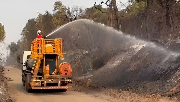 Na área urbana, o incêndio também atingiu uma grande porção de mata próxima a uma granja. As 28 famílias que residem em casas fornecidas pela empresa tiveram que evacuar até que o fogo fosse controlado.