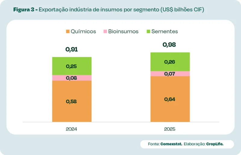 As exportações de soluções agrícolas brasileiras totalizaram US$ 976 milhões em 2025, 7% maior que no ano anterior. O valor fechado é recorde de receita no setor comparado aos últimos 14 anos, puxado principalmente pelas vendas de defensivos químicos (63%) e sementes (27%). Bioinsumos representou 7% do valor total.