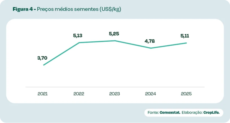 A exportação de sementes agrícolas, que já havia atingido maior patamar no quinquênio, totalizou US$ 262 milhões. O alto desempenho é resultado da valorização dos preços médios dos grãos exportados do Brasil, uma vez que o volume de sementes vendidas teve breve retração (1,1 mil), em comparação a 2024. Destaque para exportação de semente de milho com US$ 124 milhões, sementes para forrageira com US$ 75 milhões e de Hortícolas com US$ 28 milhões, 87% do total exportado pelo país. Paraguai, Colômbia e Argentina foram os principais compradores de sementes do Brasil, sendo que o Paraguai lidera a compra de sementes de milho, US$ 75 milhões.
