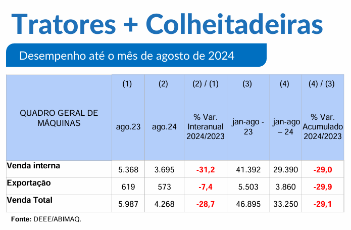 De janeiro a agosto, as vendas internas de tratores e colheitadeiras registram uma queda de 29% na comparação com os oito primeiros meses do ano passado. A exportação do segmento também caiu no período: 29,9%. Cenário que resulta numa queda total de 29,1%.