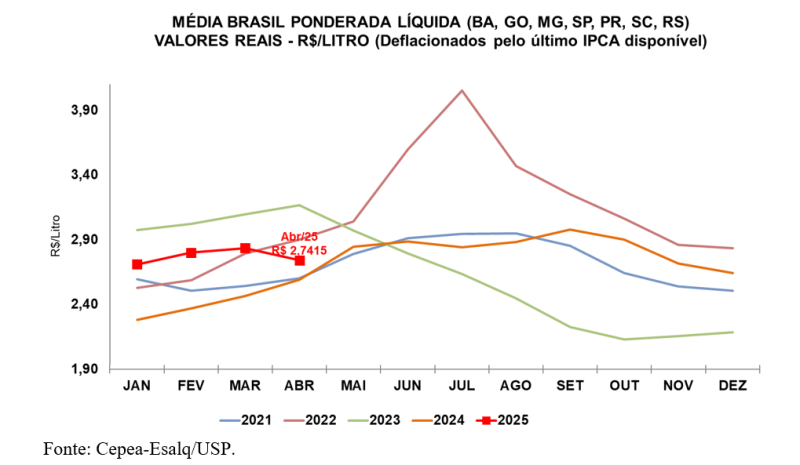Gráfico 1. Série de preços médios recebidos pelo produtor (líquido), em valores reais (deflacionados pelo IPCA de abril/2025).
