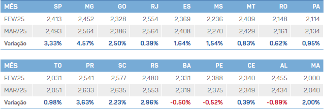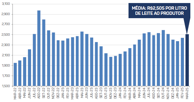 Na comparação mensal, no pagamento de março referente ao leite entregue em fevereiro, a alta foi de 2,8%, ou R$0,07/litro.