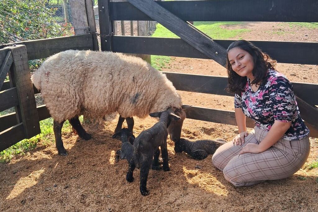 Passava das 6 horas da manhã quando a ovelha, da raça Hampshire Down, começou o trabalho de parto. Gabriely conta que ela e os pais já estavam monitorando o animal, que apresentava dificuldades de locomoção devido ao estágio avançado da gestação. Até imaginavam que pudessem vir cordeiros gêmeos, mas três… era demais: